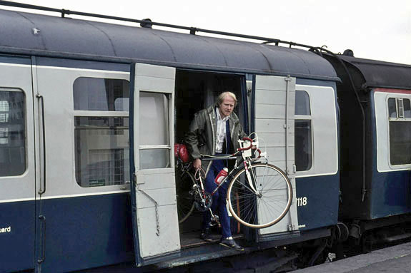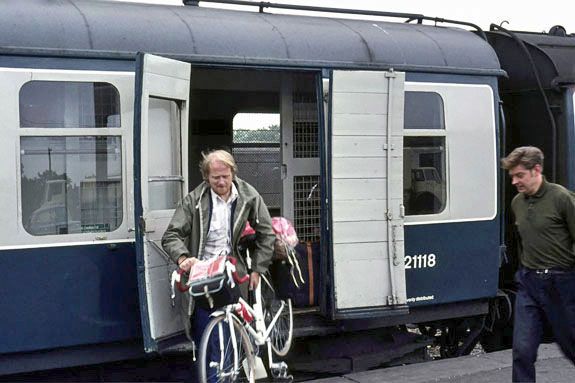 Unloading Denise's bike at Wick Station about 4pm after an overnight journey from London. The sleeper departed Euston at 21:50 and arrived in Inverness at 09:10. From there a four carriage train departed for the north, splitting up at Georgemas Junction with two carriages going to Thurso and the others to Wick.